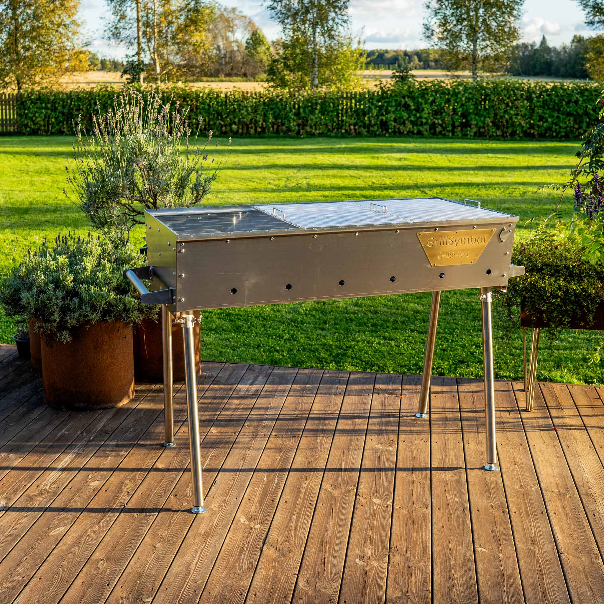 - Grillen har en vind- og sprutbeskyttelse på 116 x 15 cm (bredde * høyde)